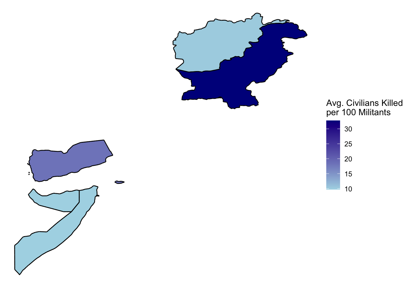 scale_fill_gradient(low = "lightblue", high = "darkblue", name = "Avg. Civilians Killed\nper 100 Militants") + theme_void()