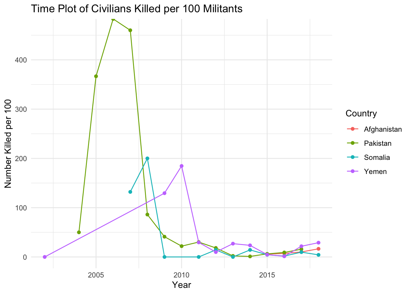This time series plot visualizes the trend of civilians killed per 100 militants over the years across different countries affected by drone strikes. Each line represents a specific country, color-coded for easy identification.